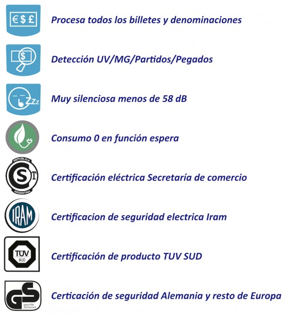Funciones: Adición / Loteo / AutoStart-Stop / Detección billetes UV/MG /Partidos / Pegados