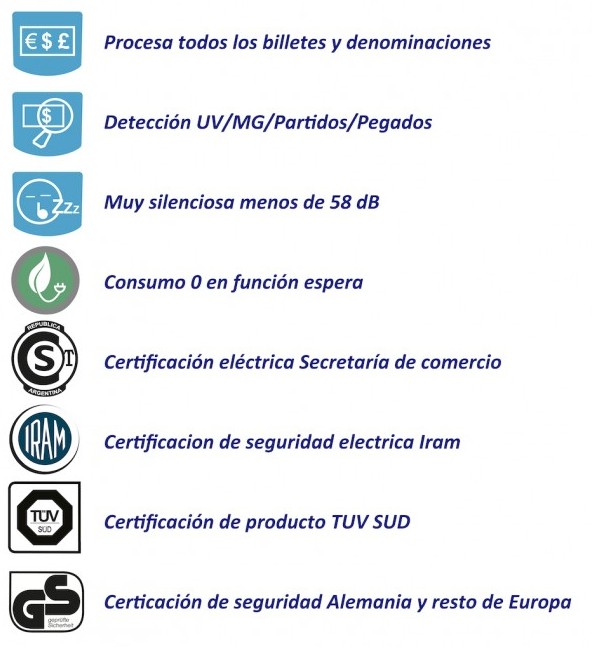 Funciones: Adición / Loteo / AutoStart-Stop / Billetes partidos / pegados / Detección falsos UV/MG